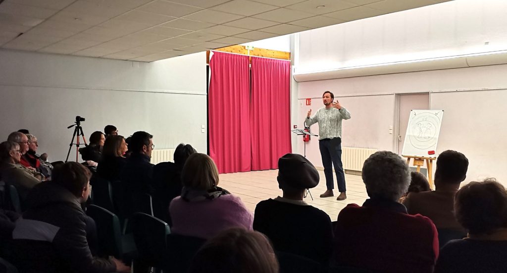 Une belle idée qui lui donna l’occasion de nous alerter sur la situation, parfois catastrophique, de la « Maison », notre terre : fonte du permafrost, réchauffement climatique, stratosphère et effet de serre… autant d’explications de ces phénomènes constatés aujourd’hui par de nombreux experts. Entre l’exposition de problématiques environnementales, l’acteur, agriculteur à ses heures perdues, a déclamé avec une belle éloquence, le lion et le moucheron, l’éléphant et le rat ou encore le chêne et le roseau… La force des tout-petits, la peur qui pousse à agir, la résistance de ceux que l’on croit faibles…Avec poésie, les morales de ces fables plus ou moins connues, argumentaient les propos se l’orateur, seul en scène.